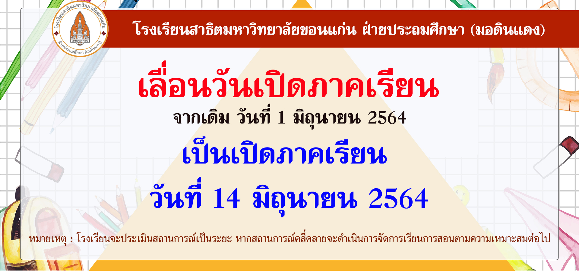 ด้วยสถานการณ์การแพร่ระบาดของไวรัสโคโรนา 2019 (COVID-19) โรงเรียนจึงเลื่อนการเปิดภาคเรียนเป็นวันที่ 14 มิถุนายน 2564
