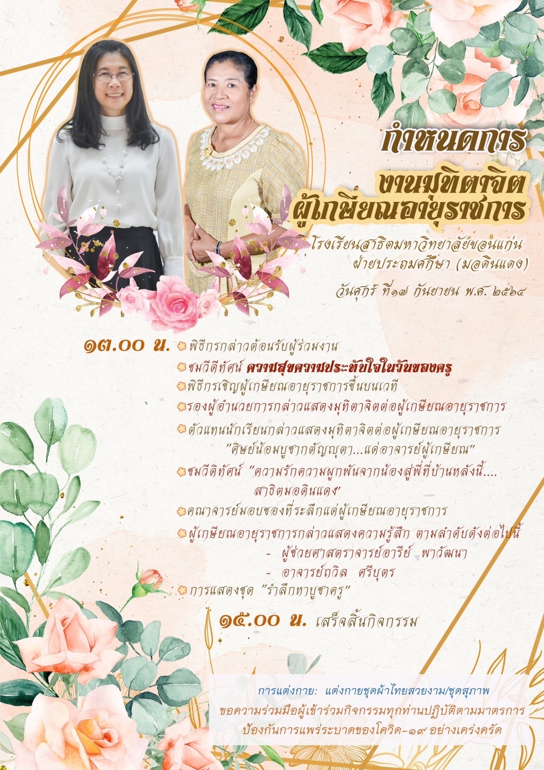 โรงเรียนสาธิตมหาวิทยาลัยขอนแก่น ฝ่ายประถมศึกษา (มอดินแดง) จัดกิจกรรมมุทิตาจิต แด่อาจารย์ผู้เกษียณอายุราชการ 2 ท่าน ประกอบด้วย ผู้ช่วยศาสตรจารย์อารีย์ พาวัฒนา และอาจารย์ถวิล ศรีบุตร ในวันศุกร์ที่ 17 กันยายน 2564 ณ ห้องประชุม โรงอาหาร ฝ่ายมัธยม (มอดินแดง) บรรยากาศในครั้งนี้เป็นไปด้วยความอบอุ่น แต่ยังคงรักษามาตรการป้องกันโรคระบาดไวรัสโคโรนา (COVID-19) โดยในกิจกรรมครั้งนี้ มีคณะผู้บริหารจากฝ่ายมัธยมศึกษา (มอดินแดง) และฝ่ายการศึกษาพิเศษ รวมถึงตัวแทนจากชมรมผู้ปกครองและครูฯ และตัวแทนจากสมาคมศิษย์เก่าฯ ร่วมมอบของที่ระลึกให้แก่อาจารย์ทั้งสองท่าน